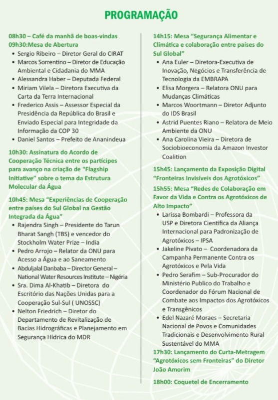 Na programação, está prevista a mesa “Redes de Colaboração em Favor da Vida e Contra os Agrotóxicos de Alto Impacto”, com participação de Jakeline Pivato, da Campanha Permanente Contra os Agrotóxicos e Pela Vida, e da professora e diretora científica da Aliança Internacional para Padronização de Agrotóxicos (IPSA), Larissa Bombardi, referência internacional no tema. A mesa também contará com a presença do subprocurador do Ministério Público do Trabalho (MPT), Pedro Serafim, e de Edel Nazaré Moraes, da Secretaria Nacional de Povos e Comunidades Tradicionais do MMA.