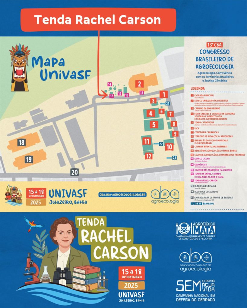 De 15 a 18 de outubro de 2025, durante o 13º Congresso Brasileiro de Agroecologia (CBA), a Tenda Rachel Carson, organizada Campanha Permanente Contra os Agrotóxicos e Pela Vida, será um dos principais espaços de debate e mobilização em Juazeiro (BA).