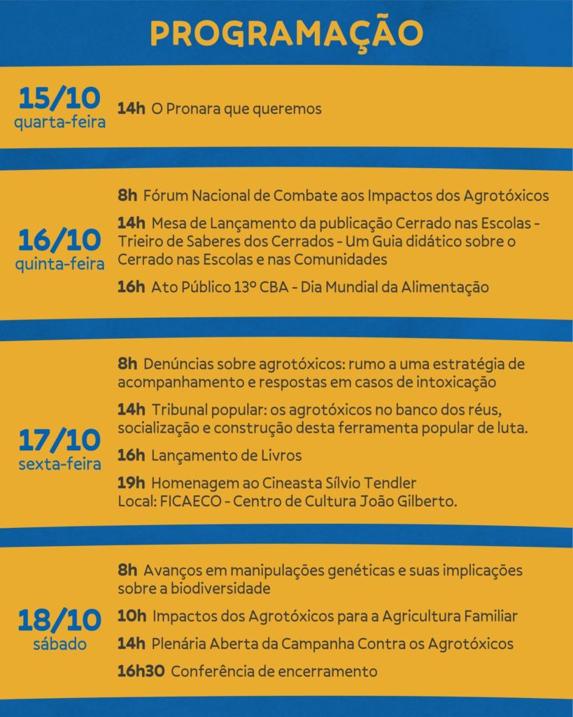 Neste ano, a programação traz rodas de conversa, oficinas, lançamentos de livros e exposições, além de um Café Literário, que vai estimular a troca de saberes em um ambiente acolhedor. O espaço conta com a parceria da Campanha Nacional em Defesa do Cerrado e do Fórum Nacional de Combate aos Impactos dos Agrotóxicos. Entre os temas em destaque estão o Programa Nacional de Redução de Agrotóxicos (Pronara), a resistência agroecológica nas escolas brasileiras e o Tribunal Popular: Agrotóxicos no banco dos réus, com a socialização de experiências de tribunais populares já realizados em diferentes territórios.