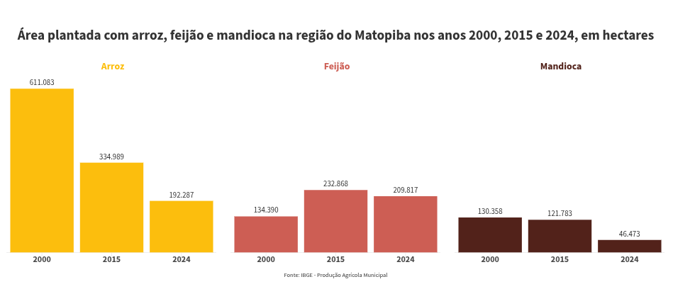 A reportagem levantou a área ocupada por essas principais culturas do prato brasileiro no Matopiba, a partir dos dados da pesquisa Produção Agrícola Municipal (PAM), também do IBGE. Os dados revelam que desde o decreto da fronteira agrária, em 2015, a região perdeu 142 mil hectares de arroz, 23 mil de feijão e 75 mil de mandioca.